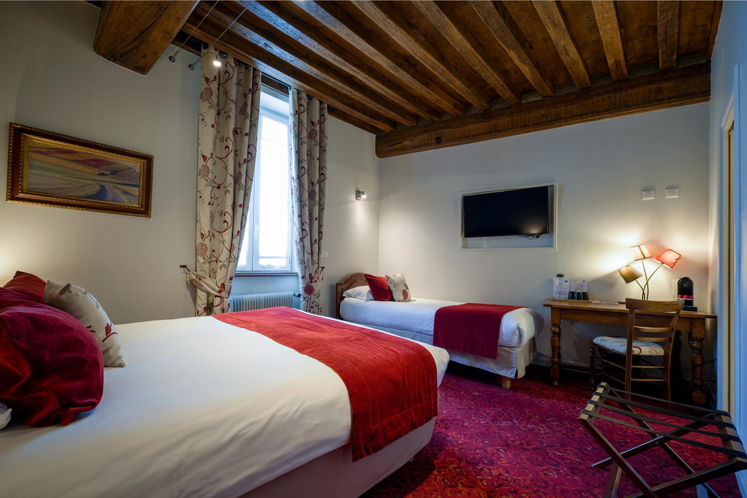 Idéales dans le cadre d’un séjour à trois en Bourgogne, les chambres triples de l’hôtel Wilson à Dijon bénéficient d’une orientation sur la cour intérieure verdoyante de l’hôtel ou sur la très réputée place Wilson. Offrant tout le confort d’un équipement moderne et décorées de mobilier Louis Philippe et Louis XIII, elles affichent un style sobre et de bon goût. Petit déjeuner en chambre ou au salon, au coin d’un feu de cheminée. Toute l’équipe de l’Hôtel Wilson vous réserve un accueil privilégié durant votre séjour à Dijon en Bourgogne, dans le cadre d’un séjour, d’un week-end ou d’un séminaire professionnel.